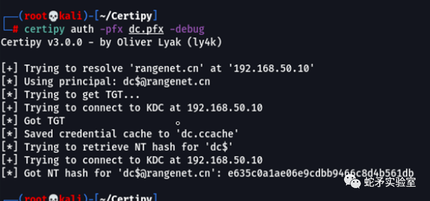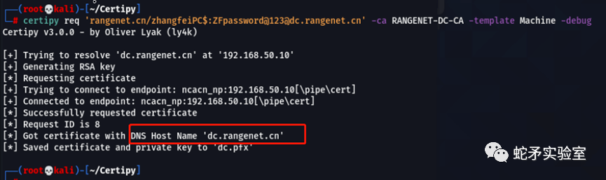 运行 Certipy 以生成机器证书, 您会注意到 DNS 主机名已改为 dc 。 我不确定您在说什么, Larenet. cn :