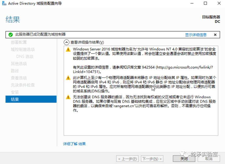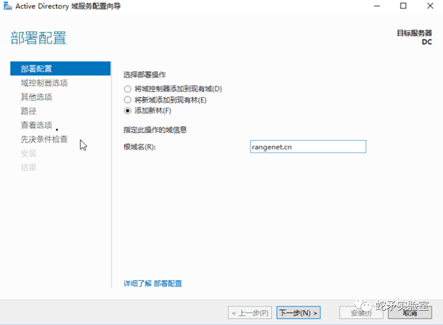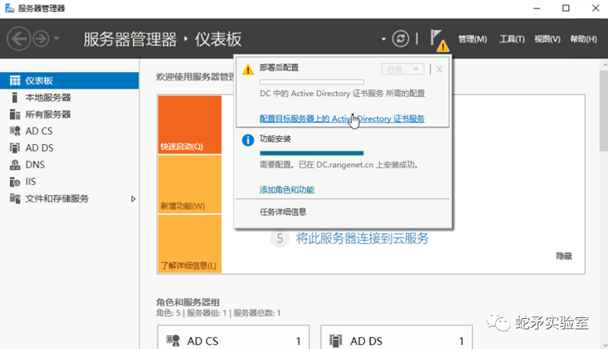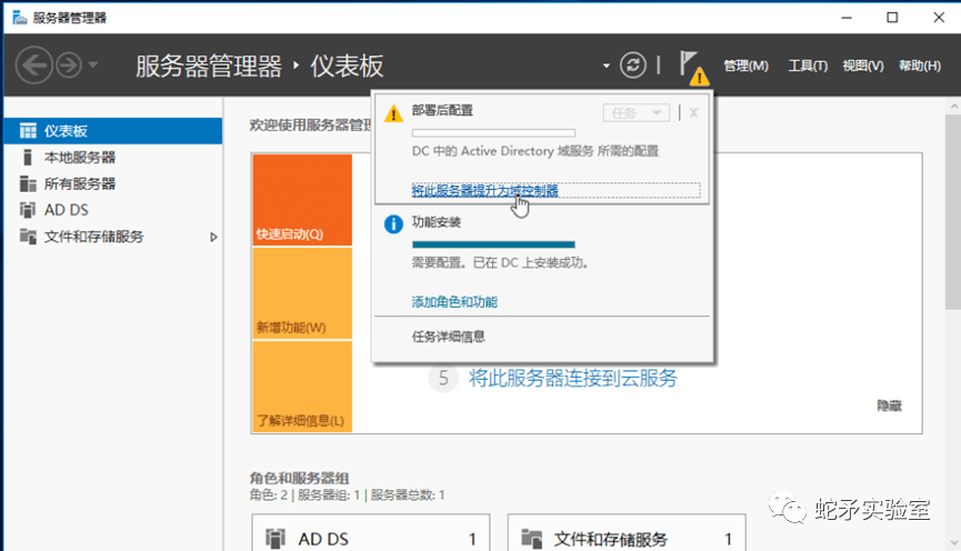 安装完成后, 升级为域控制器, 并开始配置域控件 。