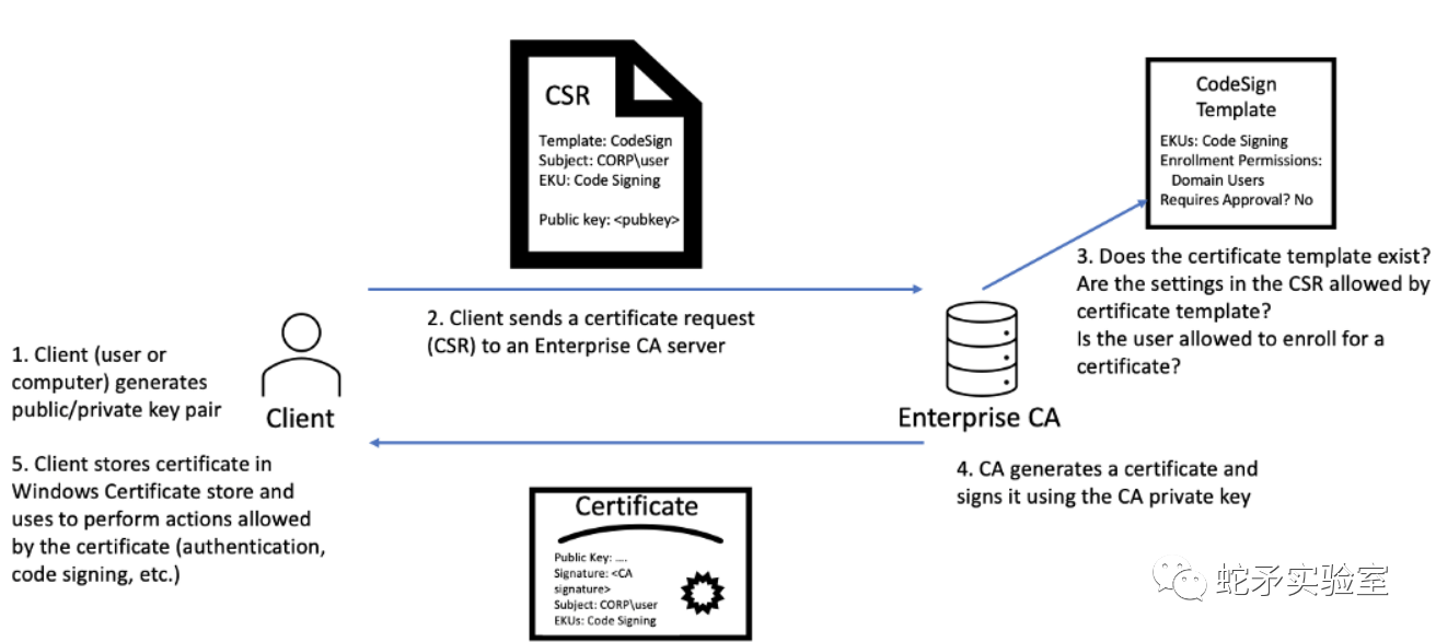 ADD CS用于一系列应用。例如,加密文件系统,或制作和验证数字签字。它甚至不是一个用户的身份, 它甚至不是一个用户的身份, 它甚至不是一个用户的身份, 它甚至不是一个用户的身份。它还为攻击者提供了适当的攻击线;由于证书始终采用转售凭单的办法,因此可以用来作为帮助攻击的工具。这意味着,即使损坏账户的密码被更改,该账户仍将被更改。它不会使欺诈产生的证书失效,也不会运作。因此,给十年 不间断的偷盗!下图说明获取和产生证书的过程。