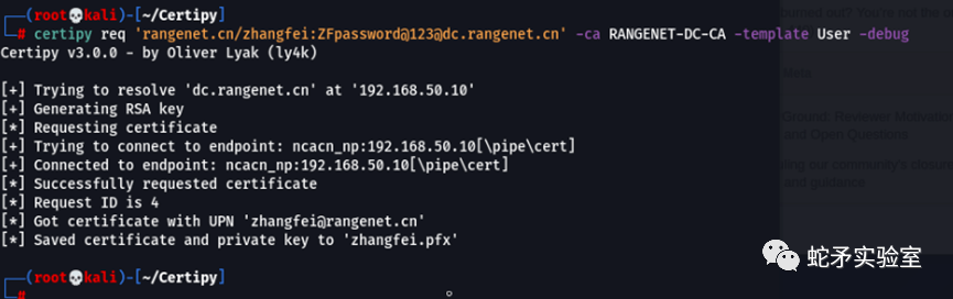 certipy req 'rangenet.cn/zhangfei:ZFpassword@123@dc.rangenet.cn' -ca RANGENET-DC-CA -template User