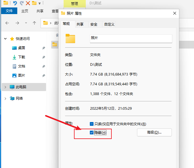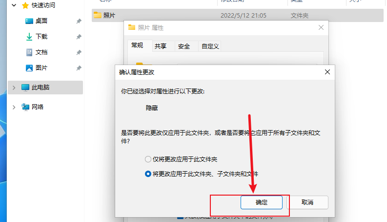 右键单击文件夹属性图标,选择隐藏,然后单击“确定”。
