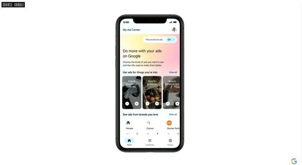 Google发布了一系列安全和隐私声明, 其中载有“我的广告中心”界面的计划:用户可以个人化他们所看到的广告, 从感兴趣的话题中选择一系列信息, 或者选择少看某个特定主题。