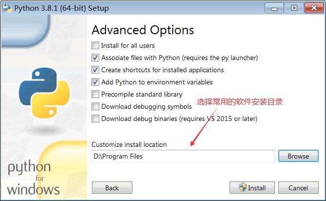 为了防止有太多的 C- disc 文件, 我们选择自定义安装 。 选择“ 强制安装” 进入下一阶段, 并选择您想要安装的 Python 组件 。