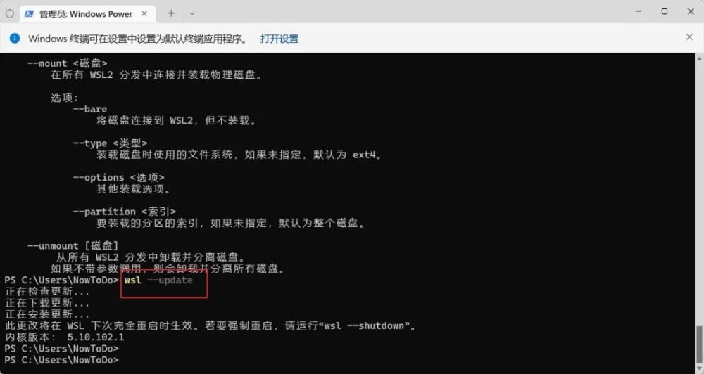 为了将 WSL 内核版本升级到最新状态, 管理员的身份打开 Windows Power 命令行窗口, 并输入: wsl- update 。