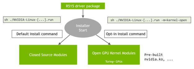 NVIDIA 开放 GPU 内核模块的首次发布现为R515, 除了源码外, 还包括一个完整创建和包装的驱动程序版本 。