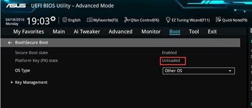 4. “BOOT- Secure Bout”, 重新进入生物,并核实平台键(PK)状态选择未加载,如下图所示: