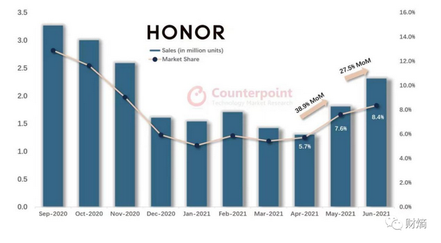 财熵注意到,从2021年第二季度开始荣耀的表现有所改善。根据 " 反点 " 组织的统计数字,2021年4月至6月连续第二个月,荣誉销售的分布有所扩大。环的上升率分别为38%、9%和5%。其国内市场份额也增加到14.6%。
