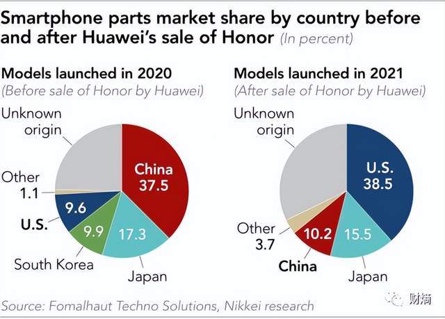 另一个令人发指的现实是,与华为分家后,日益依赖美国零部件来取得光荣。4月25日,《太阳日报》报道:Fomalhaut Techno Solutions帮助打开了2021年底推出的5G智能手机X30。为了确定内部部件的物质成本,计算智能手机中国家零部件的比例。