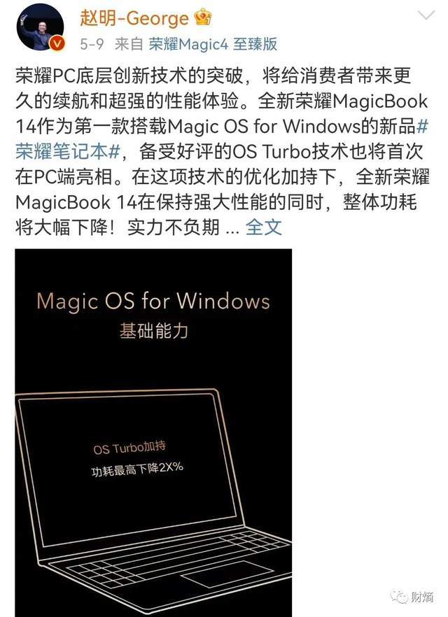 因此,当移动工业恢复时,Glory开始寻找新的增长曲线。5月9日,赵明的推文让我感到骄傲将移动电话的普及推广到个人电脑上将是我的荣幸。MagicBook14 是 Windows 的魔术操作系统的新添加 。5月16日,将与外部世界举行会议。