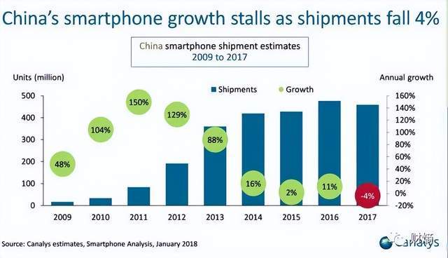 据Canarys称,中国的智能手机销售量在2017年首次下降。