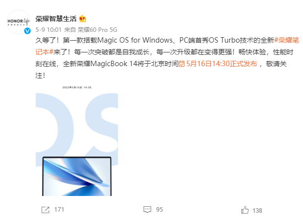 20小时超长续航功耗下降20% 全新荣耀笔记本MagicBook 14明日发布