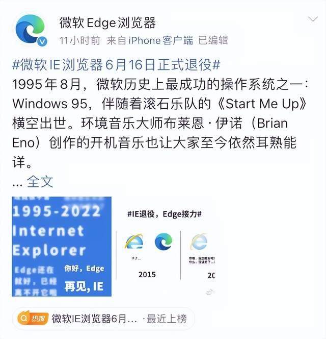 5月16日凌晨地球技术5月16日新闻披露,微软1995年引进的IE浏览器将于6月16日正式退役,此后其功能将由Edge浏览器支持。