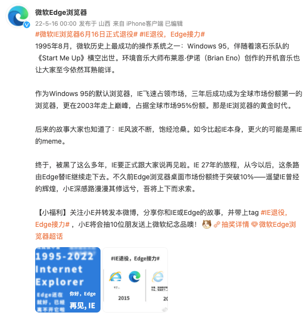 5月16日,微软边缘浏览器通过其官方推特表示,微软1995年推出的IE浏览器将于6月16日正式退休,其功能将由边缘浏览器取代。