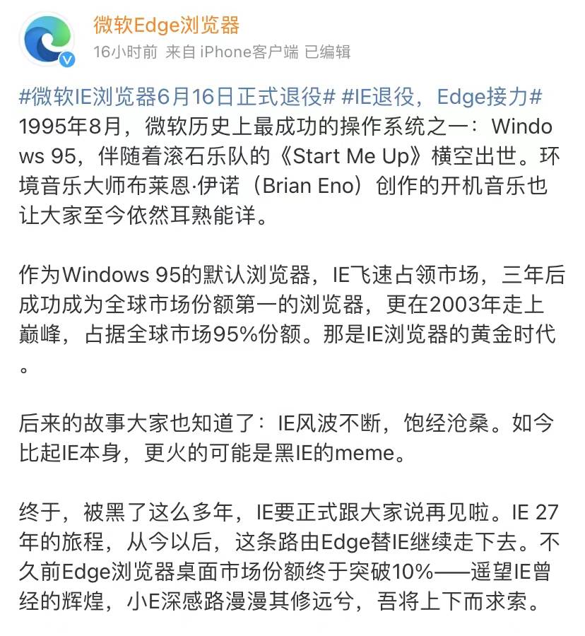 微软边缘浏览器在5月16日的官方推文中宣布, 微软 IE浏览器将于6月16日正式停用,