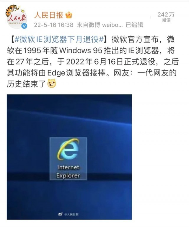 - 2022-05-26 微软IE浏览器6月16日正式退役 Edge将