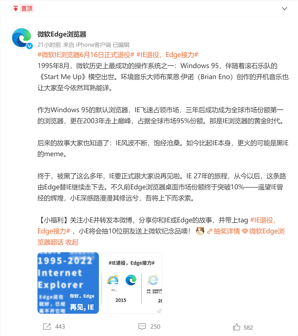 微软边缘浏览器的官方推特在今天(5月16日)零时披露微软 IE浏览器将于6月16日正式退休,此后其功能将被边缘浏览器取代。 Netizens称其为“一个时代的终结 ” 。