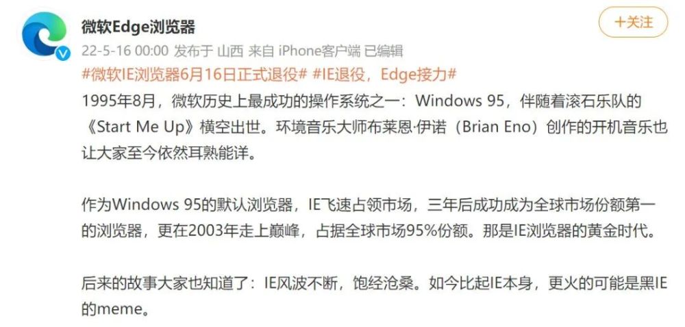 - 2022-05-26 微软IE浏览器将于6月16日正式退役