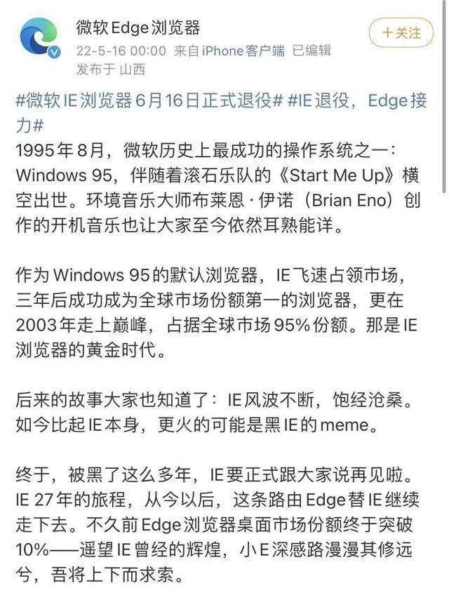微软边缘浏览器于5月16日凌晨0时正式宣布,微软 IE浏览器将于6月16日退休。