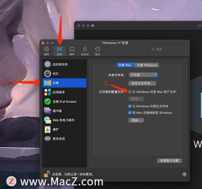 5. 输入选项设置接口后,单击左侧的 " 共享 " 、右侧的 " 共享Mac " 、不检查 " 与 Windows 共享Mac 用户文件 " 复选框。