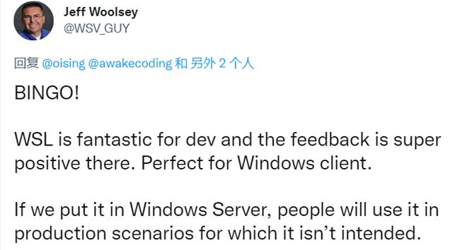 在2021年,一群博客响应用户关于将技术向后迁移到Windows Server 2019的要求,Windows服务器的牵头项目经理Jeff Woolesey在2021年初答复说WSL“非常适合开发”和“非常适合Windows客户。Windows服务器的牵头项目经理Quitef Woolesey在2021年初答复说WSL“非常适合开发”和“非常适合Windows客户”。然而,他认为WSL2并非用于工业环境。