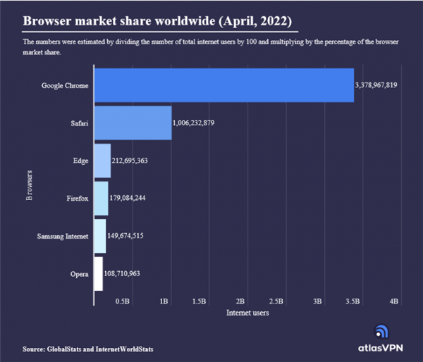 根据阿特拉斯VPN小组的结果这篇作品是我们特别报导Safari的一部分, 现在使用Safari浏览器1006232879个互联网用户(占所有互联网用户的19%)。它现在是第二大最受欢迎的浏览器,用户超过10亿。然而,Google浏览器仍是最受欢迎的浏览器。