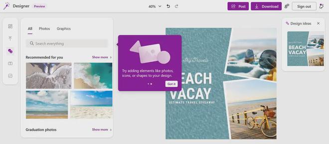 与 PowerPoint 不同, 微软设计器包含一个模板、 一个图像库、 一个形状库、 一个形状库, 以及您Instagram 或 Facebook 文章的建议。 由于这些功能, 您可以在几分钟内完成惊人的工作 。