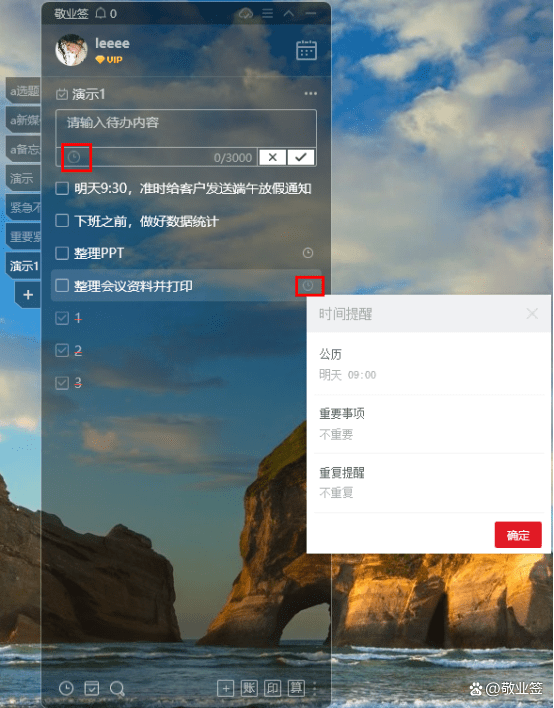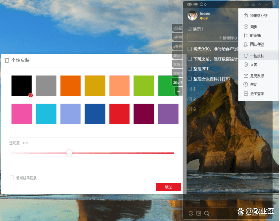 它可以同时用于几个平台(窗口/网络/Anderroid/iOS/Mac/HarmonyOS)。范围的任何一端都是解决这一问题的可行办法。下面是Windows的例子。敬业签小巧精致,它在桌面上看起来很好看。可以贴边隐藏,您也可以配置“ 嵌入式桌面 ” 。还有一个性感的皮肤可以摘取。透明度也可以调节,面值和实用性都可以得到保证。