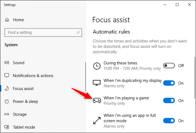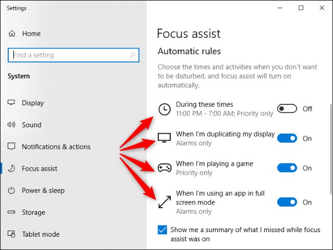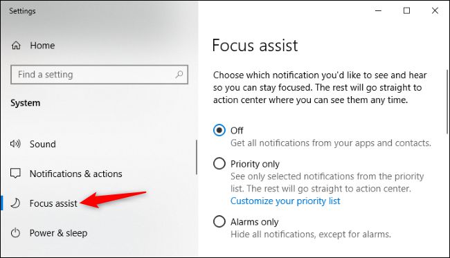 要配置 Focus Assist,请前往 Settings > System > Focus Assist。(您可以通过按 Windows+i 快速打开“设置”窗口。)