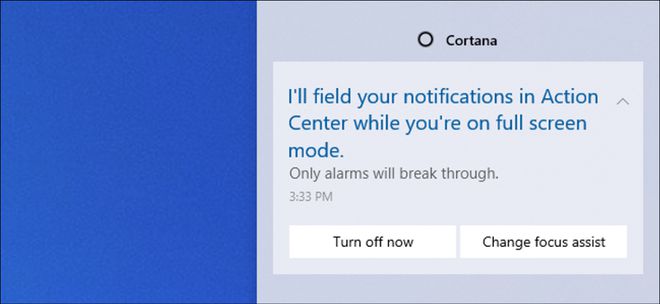 在 Windows 10 中,协助是一个不干扰模式。启用后,它自动隐藏收到的通知。因此,如果你玩游戏、演示或使用任何全屏程序,他们不会驱逐你们,也不会分散你们的注意力。援助人员还可以安排在一天的某些时间保持安静。当您退出焦点援助模式时,您会看到通知。但是,无论是玩游戏, 使用全屏模式, 还是克隆你的显示器,科塔娜说"我会将你的通知传送到行动中心"下面是如何关闭这些通知。