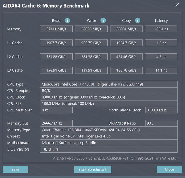 这个地面笔记本工作室配有16GB的LPDCP4X RAM,运行时间为4266兆赫。AIDA64试验的记忆读、写和复制速度分别为57411 MB/s、60500 MB/s和58901 MB/s。105.4吨延迟