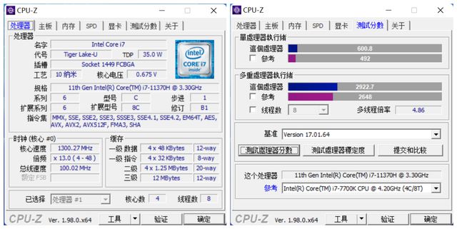 Intel 10nm SuperFin 列车11代组合处理器i7 -11370H 赋予这个地表笔记本工作室权力。它基于虎湖H35的基本设计。主要频率为330千兆赫。最高正常频率为4.8千兆赫。三级缓存12MB,支持12-35W的技术发展方案动态。CPU-Z运行失败测试已经进行了很长时间了。其核心总得分为600.8。 2922. 七个得分是多重得分。i -7700k 七代台式CPU, 单子多核酸分数优于相同的4核酸8线i -7700k。一种核酸的好处明显更为明显。总体业绩令人满意。