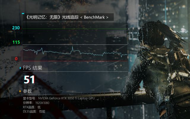 光内存:无线1080P分辨率,低质量光跟踪,以DLSS性能模式设定51个FPS框架率。