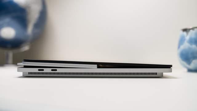 跟设计一样,地面笔记本电脑演播室的接口装置同样是基本但坚固的基础。左侧有两个雷电4接口右侧安装了1个地表连接磁吸入接口和1个3.5毫米耳机接口。比较特别的是,此外,在飞机两侧安装了散热器。