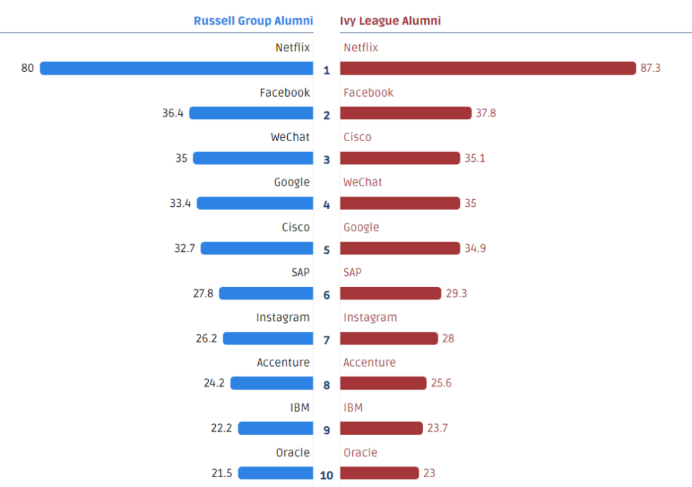 另外,C. 将下列索赔:Netflix在美国从罗素集团或常春藤大学毕业的工人中所占百分比最高。在1000名员工,Netflix有80名学生从Russell集团毕业。常春藤大学有87名毕业生。