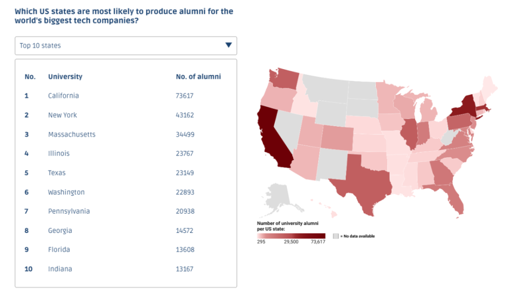在主要技术企业中最受欢迎的十大美国机构如下: