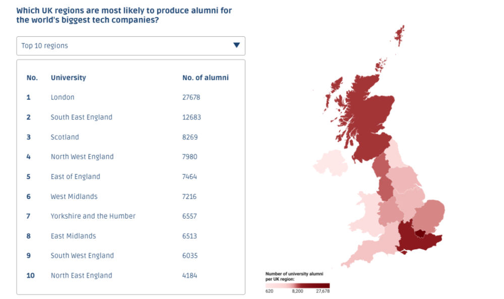 这些技术公司优先考虑伦敦、联合王国和美利坚合众国加利福尼亚的毕业生。