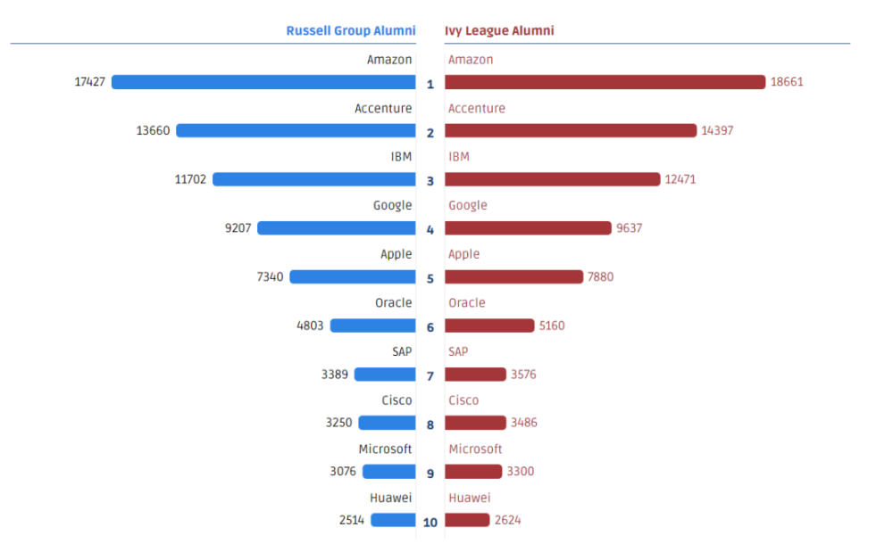 根据调查数据,联合王国大学集团毕业人数最多的十大技术企业包括亚马孙、Essencio、IBM、Google、苹果、Oracle、SAP、Cisco、微软和中国的Hua Xuan。