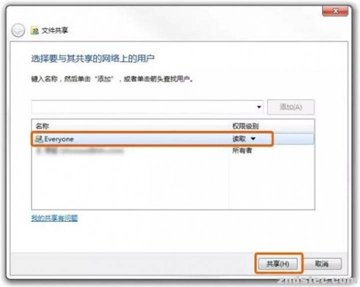 三. 在文件共享框中,单击投放框,选择 " 每个人 ",然后单击 " 添加 " 按钮。