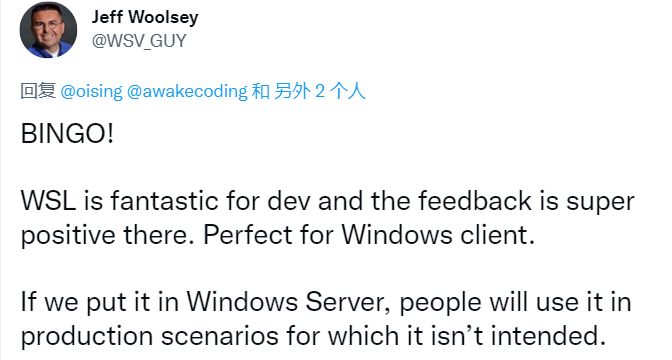 在2021年,为了 回复用户关于将技术还给Windows服务器2019,Windows服务器的请求。 首席项目经理Jeff Woolesey在2021年初评论说,WSL“完全适合发展”和“非常适合Windows客户”,但WSL2并非用于生产环境,项目总经理Exextremelyf Woolesey在2021年初答复说,WSL“完全适合发展”和“非常适合Windows客户”,但WSL2不是设计用于生产情景的。