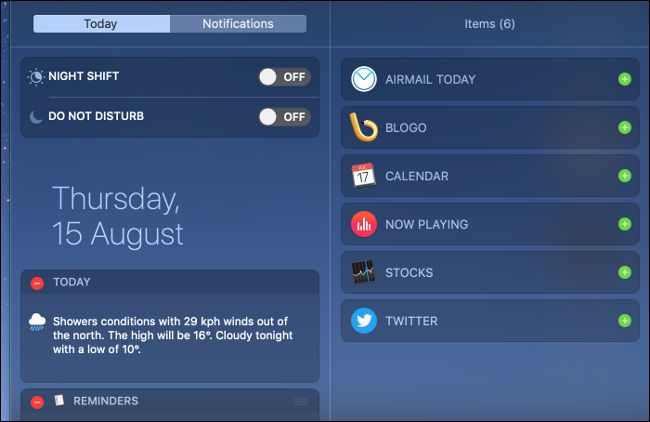 可在菜单栏右上角看到图标。您可以点击打开通知中心或今天的屏幕。您也可以从触摸面板右边缘向内滑动。MACOS系统包括一个强有力的通知系统。这就是他们都出现的地方。向上滚动,不启用干扰模式和夜班。