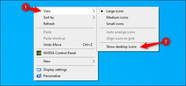 要隐藏或取消所有桌面图标, 请右键单击桌面, 点到视图, 然后选择 显示桌面图标。 此选项可以在 Windows 10, 8, 7, 甚至 XP 中找到 。