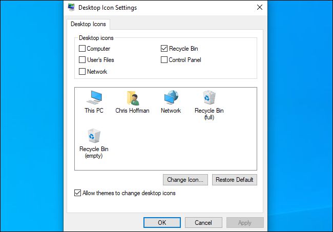 您也可以在 Windows 中隐藏内置桌面图标 。比如 "这台电脑" "网络" 和"回收"如果这些图标仍然缺失,或者如果您想要隐藏这些图标,而不是其他桌面图标,则必须控制设置或控制面板应用程序中显示哪些桌面图标。