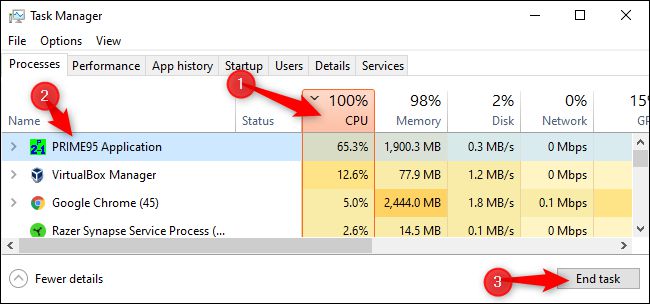 选择进程选项卡 - 如果您看不到, 请单击“ 更多信息 ” 。 任何消耗大量 CPU 的流程, 您可以单击 CPU 列标题并查看列表顶端最严格的进程, 按 CPU 消耗率排序 。
