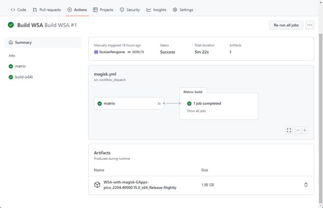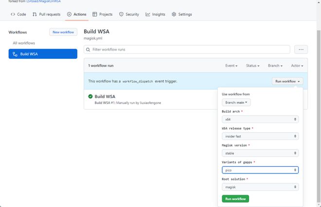 在WSA项目叉子上的玛吉斯克如果这是你第一次创建进程,请单击“动作”。发现构建 WSA 和在运行工作流程中选定的建设参数: 在此选择构建拱门中的 x64 。WSA 版本选择最快的,吸食皮科,其他默认不变。最后,单击运行进程启动工作流程。