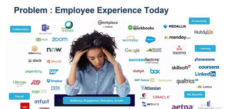 因此,沃尔玛拥有80个不同的管理系统,最大的大制药公司拥有120多个不同的办公工具,研究表明,人员培训部门平均有23个不同的应用。