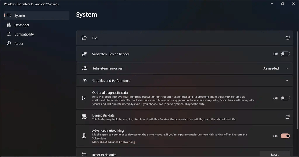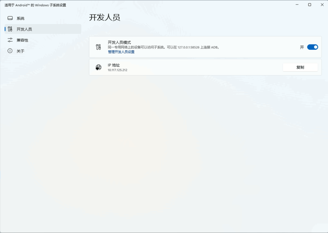 以前,《开发者模式》被正式委托给另一个分组,即开发者。我们可以使用这个网关访问WSA开发商模式。ADB 命令用于手动安装程序; 在新组中, 可以为每个安装应用程序定义“ 兼容性 ” 。例如,我们现在可以强迫应用不可调整的应用程序。和箭头,等等。由于WSA建在Linux 2的Windows子系统上, 门户的新版本还包括“备选诊断数据”和“高级网络”选项。此后,WSA和Windows核心系统一直没有进入网络部分。这使得我们很难上网进入子系统。