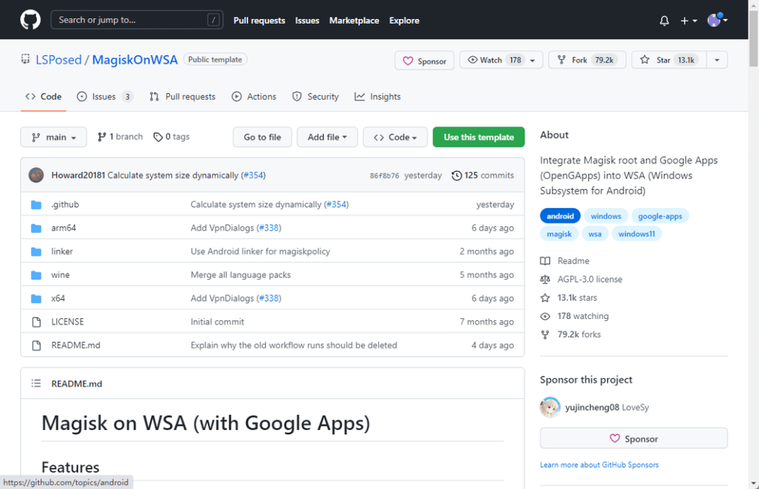 如果您手动更新以上操作, 我们需要手动卸载已安装的 WSA, 然后我们登录到 GitHub 并找到它, 如果您不需要建立账户 。 MagiskOnWSA 工程项目并将其投入自己的图书馆