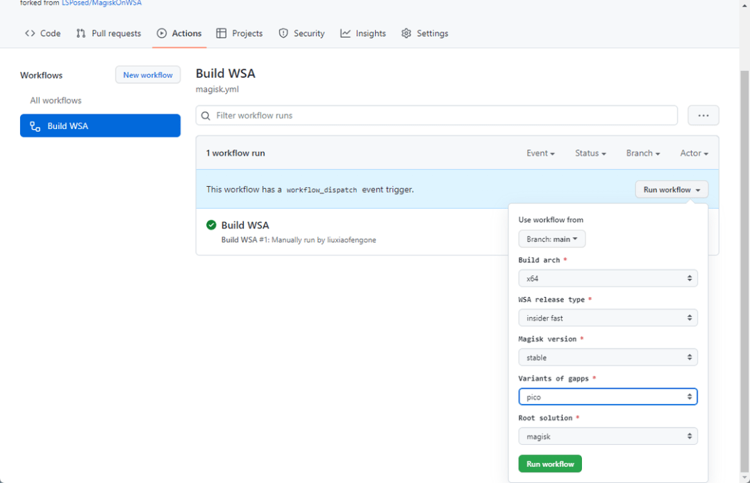 在 WSA 叉口中, 请单击“ 动作”( 如果您最初点击以建立工作流程), 然后构建“ 动作” 。 Run workflow 选择构建参数: 这是在建筑Arch 中选择 x64, WSA 版本的选项 。 fast ,gapps 选择 pico 其余的默认值被单独保留。 最后, 单击启动进程来启动工作流程 。