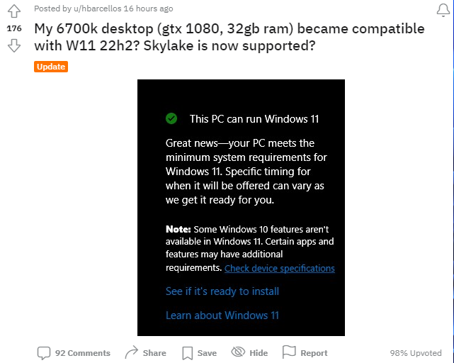 例如上图所示, Reddit用户 @AceRimmer412在i5-7200U处理器的Windows 10设备上获得了Windows 11 22H2升级。看起来十分迷惑,不排除是错误的可能性。