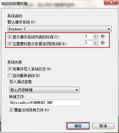 3.选择“显示操作系统列表时间”和“在需要时显示恢复选项”以设置启动时间为3s,按确认,如图所示: